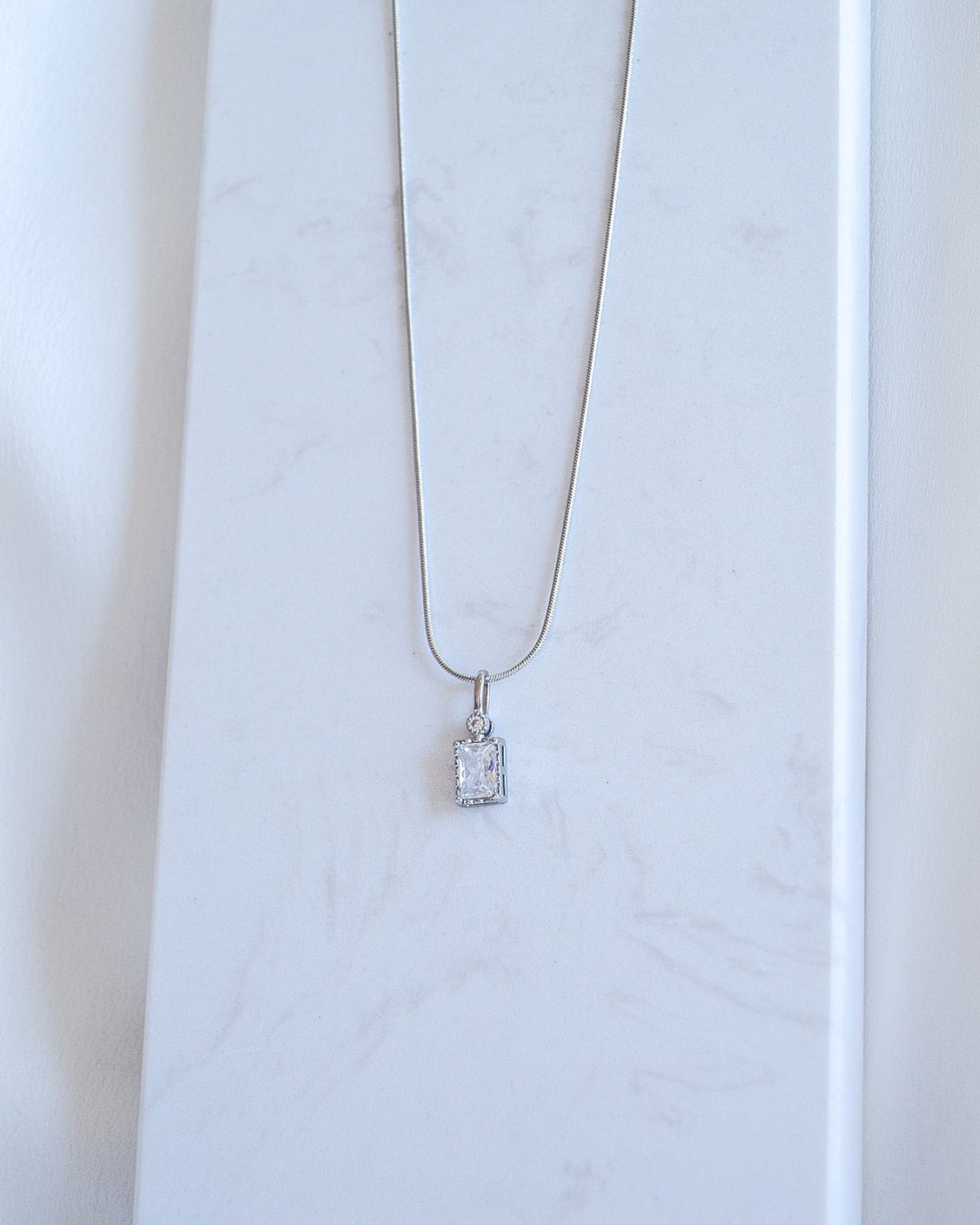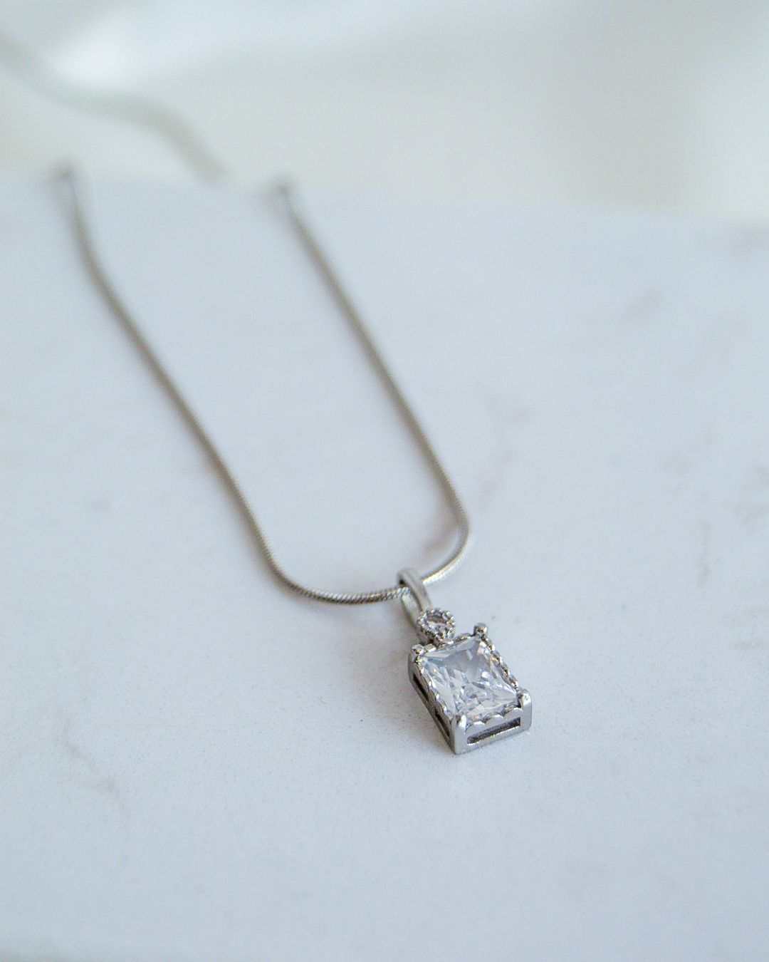 Collar acabado en plata con circonita rectangular.
